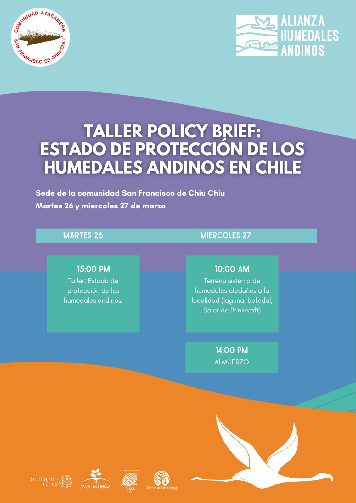 Los días 26 y 27 de marzo participamos en un interesante taller sobre el estado de protección de los humedales andinos en el territorio de Chiu-Chiu. Hicimos un recorrido por los salares de Rudolph y de Brinkeroft, así como por la laguna Inca-Coya, donde pudimos observar cómo antiguamente el acuífero tenía un nivel más alto. A lo largo del recorrido pasamos por el río Loa y su afluente el Salado. En el vado del Salado es donde empieza el bofedal que llega a la laguna. Fue impresionante ver cómo la vida se abre paso, se despliega y muestra toda su diversidad y belleza. Sin embargo, fue triste constatar el estado de abandono en que se encuentra el salar de Rudolf, ya que todo su entorno se ha convertido en un gran basural. Ojalá se tomen las medidas pertinentes para poder recuperar y preservar este ecosistema único.