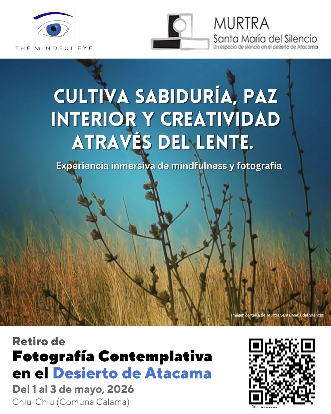 Únete a un estimulante y reponedor fin de semana en la Murtra Santa María del Silencio (Desierto de Atacama), usando la cámara de tu celular (o la que desees) junto a la práctica de mindfulness o atención plena. Explora nuevas formas de ver y crear fotografías que surgen de un espacio más personal e íntimo.
